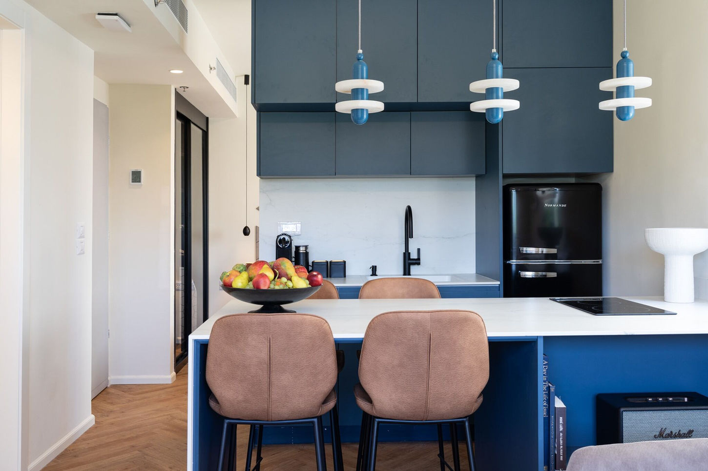 Люкс черпает вдохновение из моря и живописных пляжей Тель-Авива. Его освежающие синие тона привносят ощущение воздушности и открытости, создавая атмосферу простора и свободы. Esta herramienta estética está dotada de vídeo de alta calidad en el hogar de Sheynkin, según el tipo de persona que desee. Люкс включает в себя шикарную гостиную, изящно спроектированную синюю кухню с обеденным баром, который также является безмятежным рабочим пространством, что добавляет функциональности люксу. Además, hay una zona de baño con una habitación grande "king-size" y una cama nueva con un dormitorio grande.